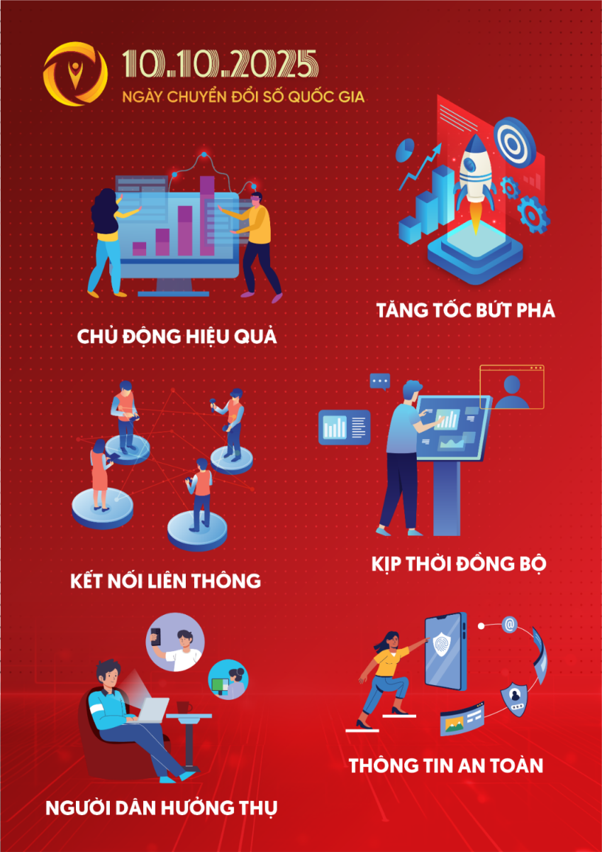 Theo đó, Bộ nhận diện Ngày Chuyển đổi số quốc gia năm 2025 gồm các hạng mục: avatar, backdrop, banner, infographic, poster và standee, được thiết kế hiện đại, thể hiện tinh thần đổi mới sáng tạo, kết nối và phát triển bền vững trong kỷ nguyên số. Các sản phẩm nhận diện hướng tới việc truyền thông trực quan, lan tỏa thông điệp ý nghĩa của Ngày Chuyển đổi số quốc gia, góp phần nâng cao nhận thức, thúc đẩy sự tham gia của toàn xã hội vào tiến trình chuyển đổi số quốc gia