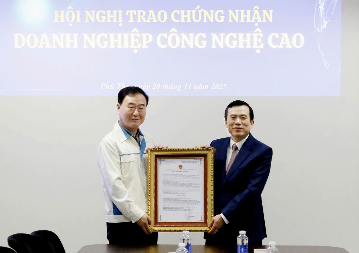 Đồng chí Nguyễn Minh Tường - Tỉnh ủy viên, Giám đốc Sở Khoa học và Công nghệ trao giấy chứng nhận Doanh nghiệp công nghệ cao cho Công ty TNHH Công nghệ Namuga Phú Thọ (tháng 11/2025)