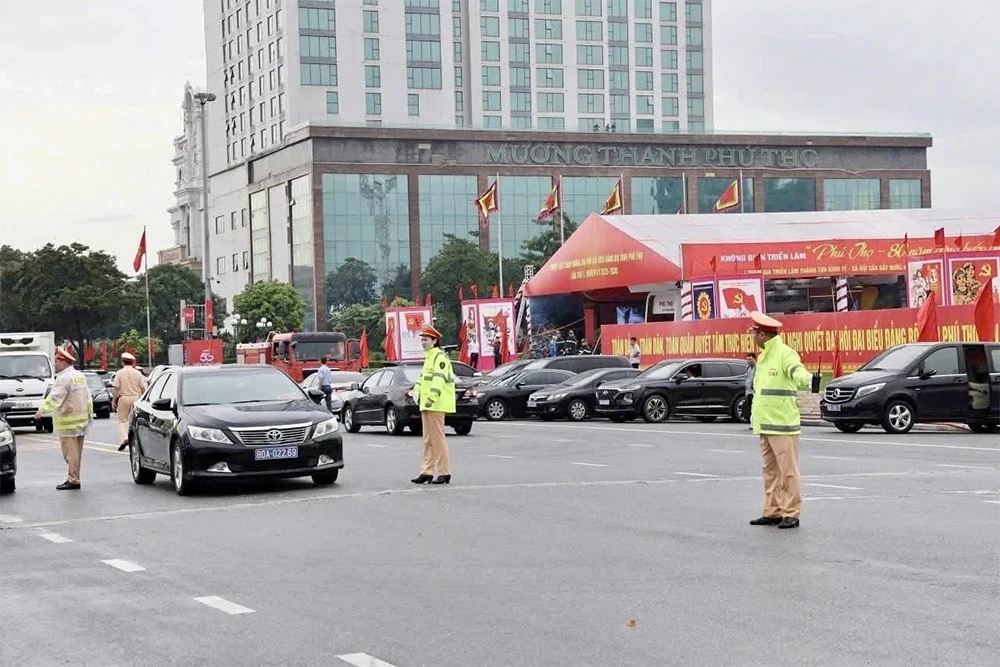 Lực lượng Cảnh sát giao thông tỉnh Phú Thọ túc trực từ sáng sớm, đảm bảo an toàn, thông suốt giao thông tại khu vực diễn ra Đại hội. Ảnh: CTV