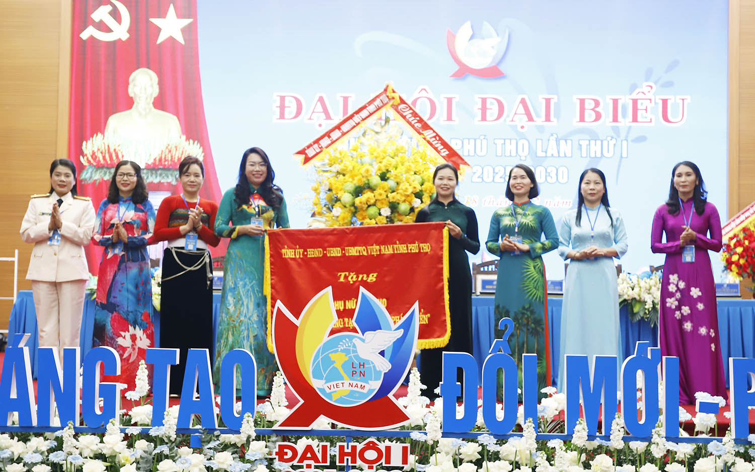 Phó Bí thư Tỉnh ủy, Chủ tịch Ủy ban MTTQ tỉnh Bùi Thị Minh tặng hoa và Bức trướng chúc mừng Đại hội với dòng chữ “Hội LHPN tỉnh Phú Thọ: Đoàn kết - Sáng tạo - Đổi mới - Phát triển”