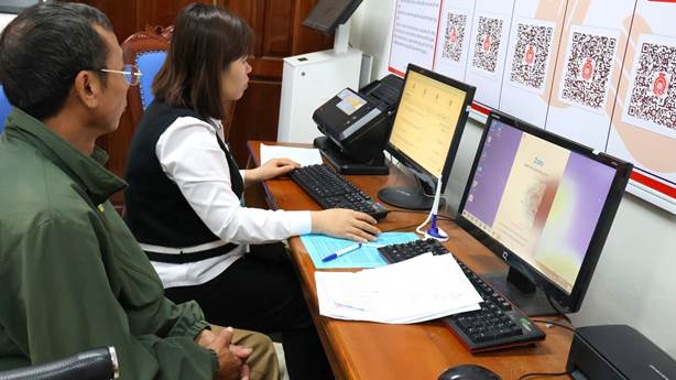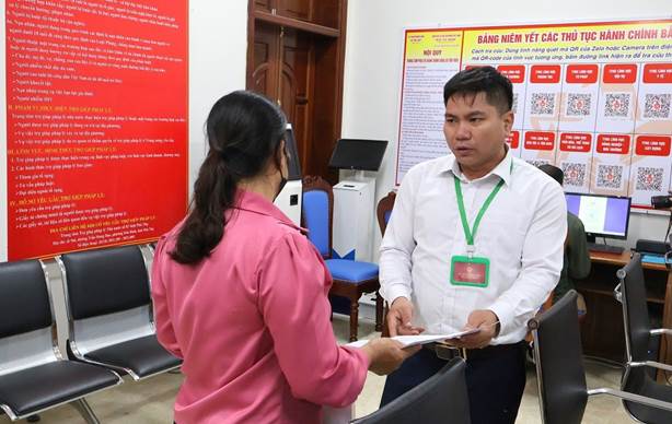 Cán bộ Trung tâm Phục vụ hành chính công xã hỗ trợ người dân trong giải quyết hồ sơ thủ tục hành chính