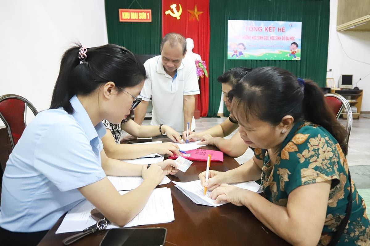 Nhân viên Bảo hiểm xã hội hướng dẫn người dân thành phố Việt Trì làm thủ tục đăng ký nhận chi trả các chế độ qua tài khoản ngân hàng
