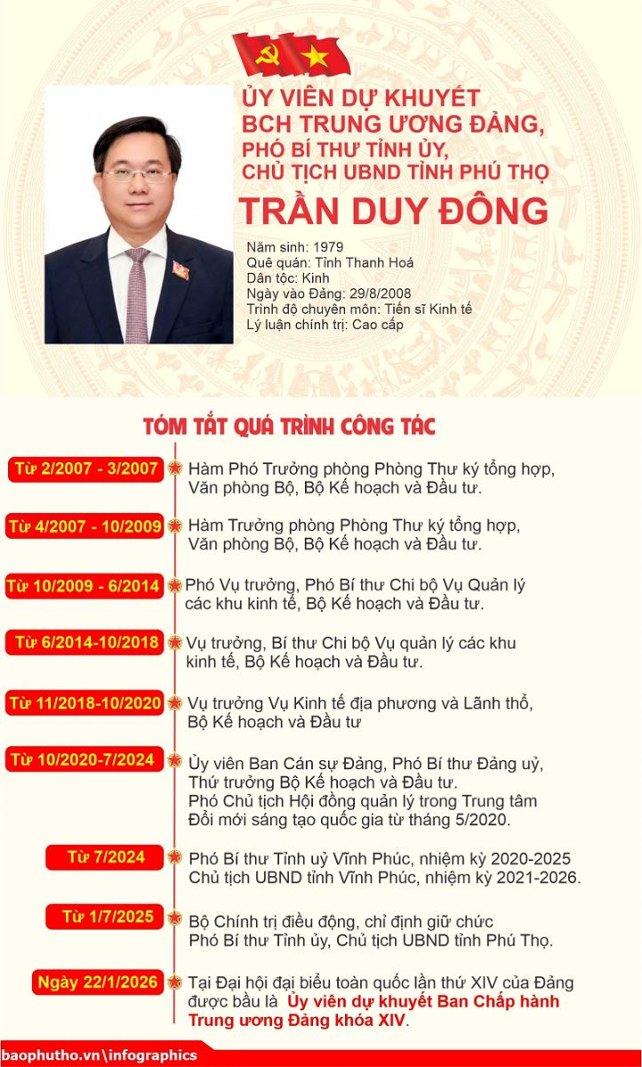 Đoàn đại biểu Đảng bộ tỉnh Phú Thọ vinh dự có 2 đồng chí được bầu vào Ban Chấp hành Trung ương Đảng khóa XIV. Trong đó: Đồng chí Phạm Đại Dương - Ủy viên Ban Chấp hành Trung ương Đảng khoá XIII, Bí thư Tỉnh ủy tái đắc cử vào Ban Chấp hành Trung ương Đảng khóa XIV. Đồng chí Trần Duy Đông - Phó Bí thư Tỉnh ủy, Chủ tịch UBND tỉnh được bầu là Ủy viên dự khuyết Ban Chấp hành Trung ương Đảng khóa XIV.