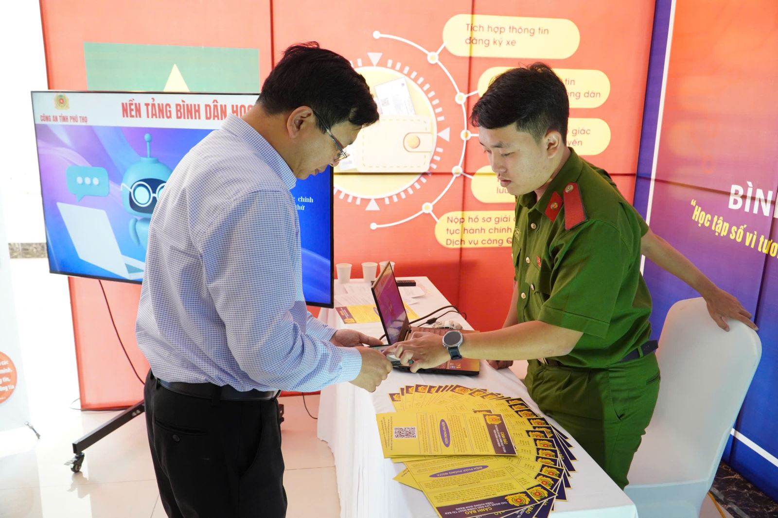Các đại biểu được hướng dẫn sử dụng nền tảng “Bình dân học vụ số” tại khu trưng bày của Công an tỉnh…