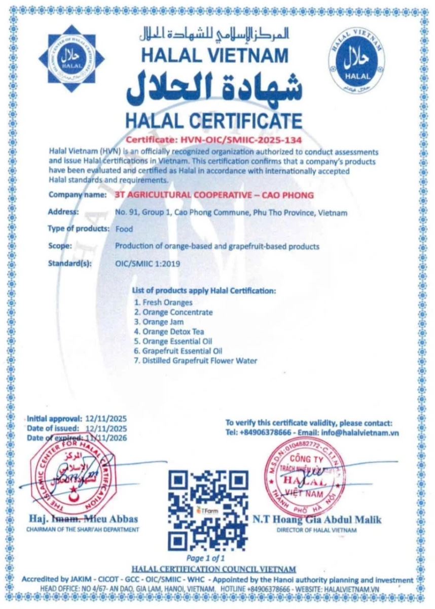 Trung tuần tháng 11, niềm vui lớn đến với HTX 3T Nông sản Cao Phong (3T Farm) khi sản phẩm cam của HTX đạt chứng nhận Halal theo tiêu chuẩn nghiêm ngặt của HVN và OIC/SMIIC, trở thành đơn vị trồng cam đầu tiên của tỉnh sở hữu chứng nhận uy tín này. Đây là cột mốc quan trọng khẳng định chất lượng sản phẩm của HTX hoàn toàn phù hợp với các tiêu chuẩn Halal quốc tế, mở ra cơ hội vươn xa trên thị trường toàn cầu. Sản phẩm của HTX còn đạt các chứng nhận ISO 22000:2018, Eurofins, kiểm nghiệm hơn 900 chỉ tiêu an toàn và dinh dưỡng đầy đủ.