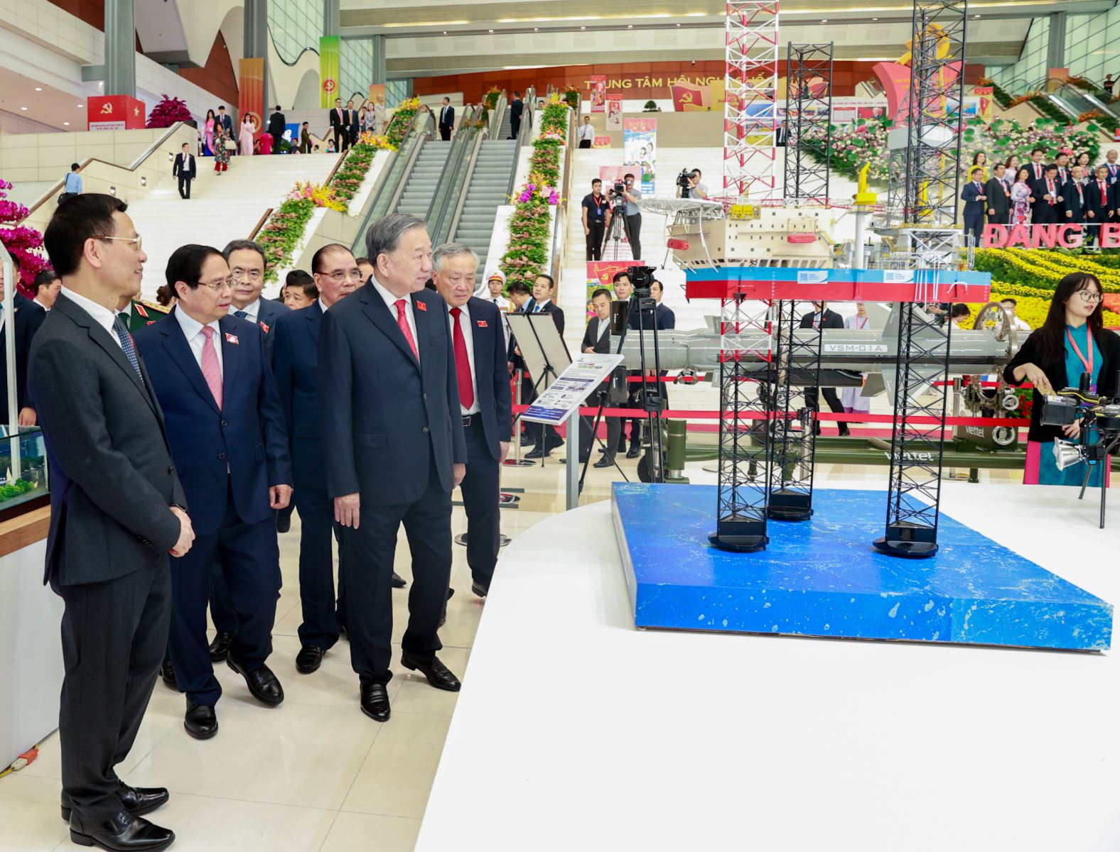Tổng Bí thư Tô Lâm, Thủ tướng Phạm Minh Chính và các đại biểu tham quan triển lãm thành tựu KH,CN, ĐMST&CĐS trong khuôn khổ Đại hội.