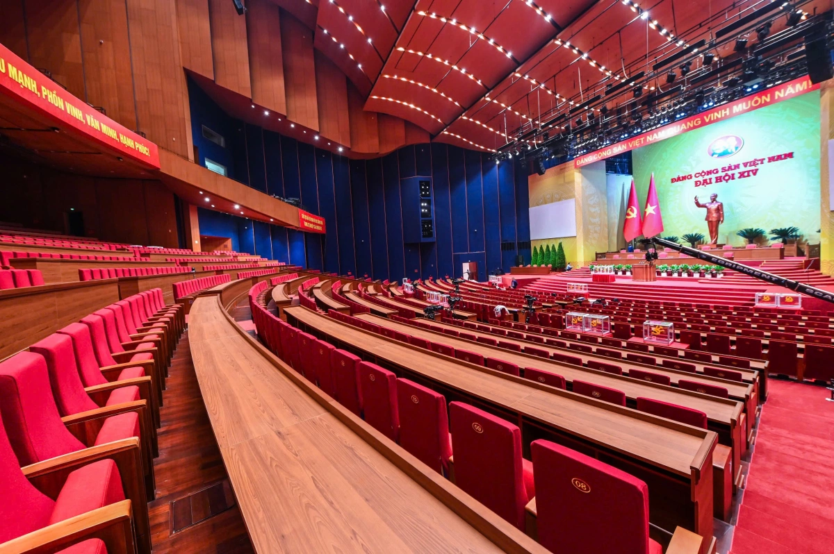 Hội trường chính tại Trung tâm Hội nghị Quốc gia - nơi sẽ diễn ra các phiên họp Đại hội XIV của Đảng. Phía trên là khu vực làm việc của Đoàn Chủ tịch Đại hội.