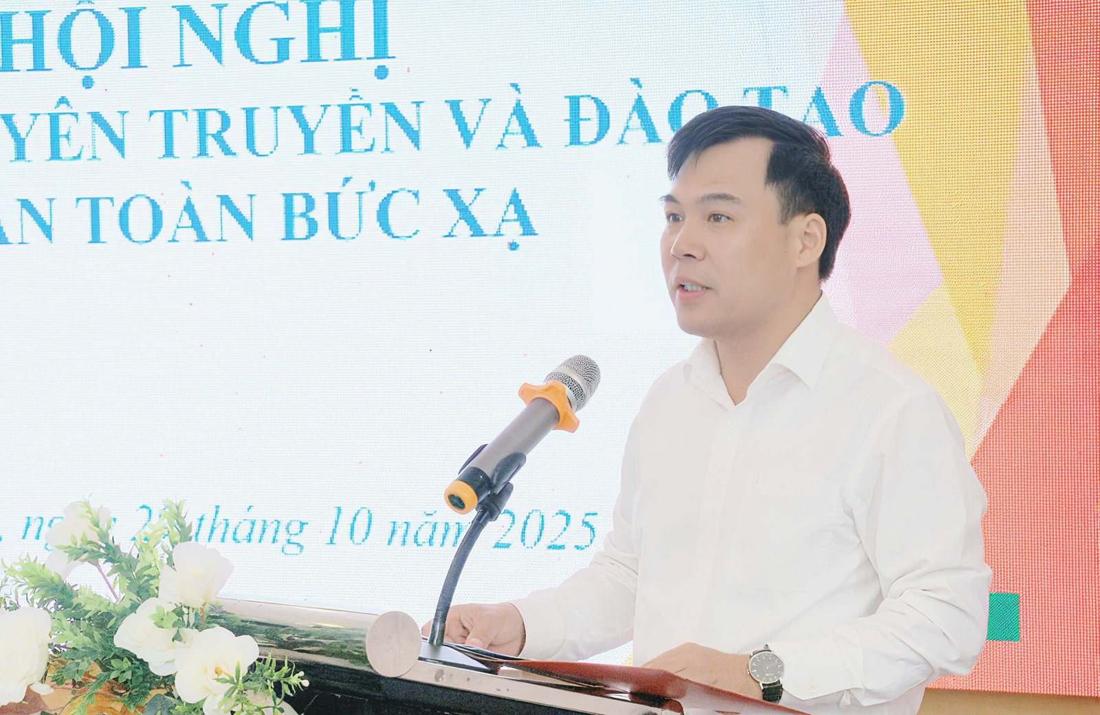 Ông Nguyễn Bình Khiêm - Phó Giám đốc Sở Khoa học và Công nghệ phát biểu tại Hội nghị tập huấn, đào tạo về an toàn bức xạ và hạt nhân (tháng 10/2025)