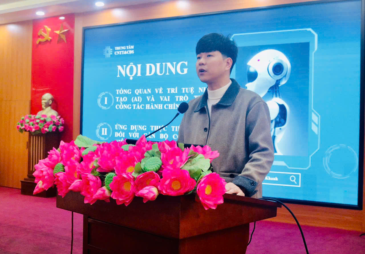 Cán bộ Trung tâm Công nghệ thông tin và Chuyển đổi số giới thiệu, hướng dẫn ứng AI trong hỗ trợ quản lý nhà nước và xử lý công việc.