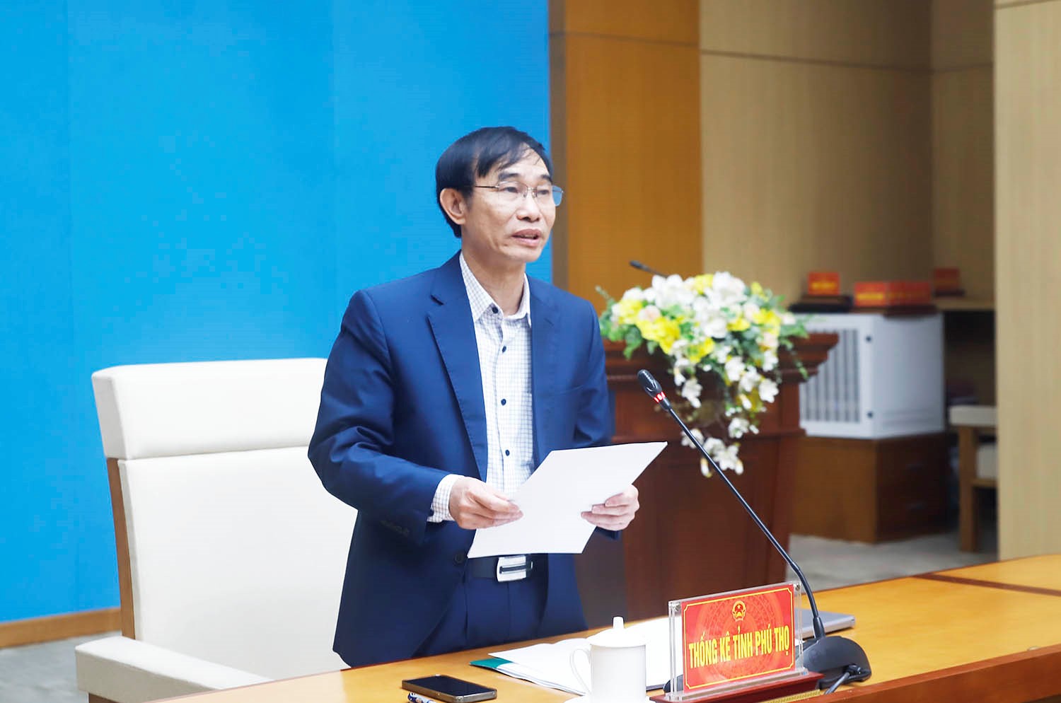 Đồng chí Trần Văn Thạch - Trưởng Thống kê tỉnh, Phó Trưởng Ban Thường trực Ban Chỉ đạo Tổng điều tra nông thôn, nông nghiệp năm 2025 của tỉnh Phú Thọ phát biểu tham luận tại hội nghị