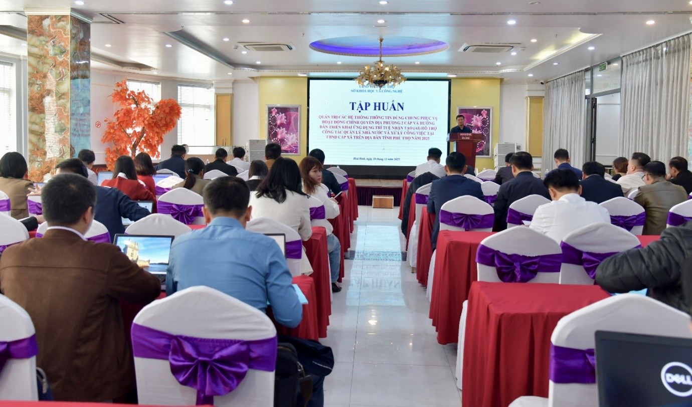 Ngày 10/12/2025, tại phường Hòa Bình, Sở Khoa học và Công nghệ tỉnh Phú Thọ đã tổ chức lớp tập huấn chuyên sâu về quản trị hệ thống thông tin dùng chung và ứng dụng trí tuệ nhân tạo cho đội ngũ công chức chuyên trách, phụ trách chuyển đổi số của UBND cấp xã.