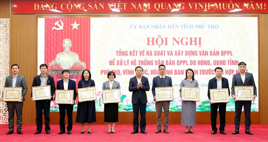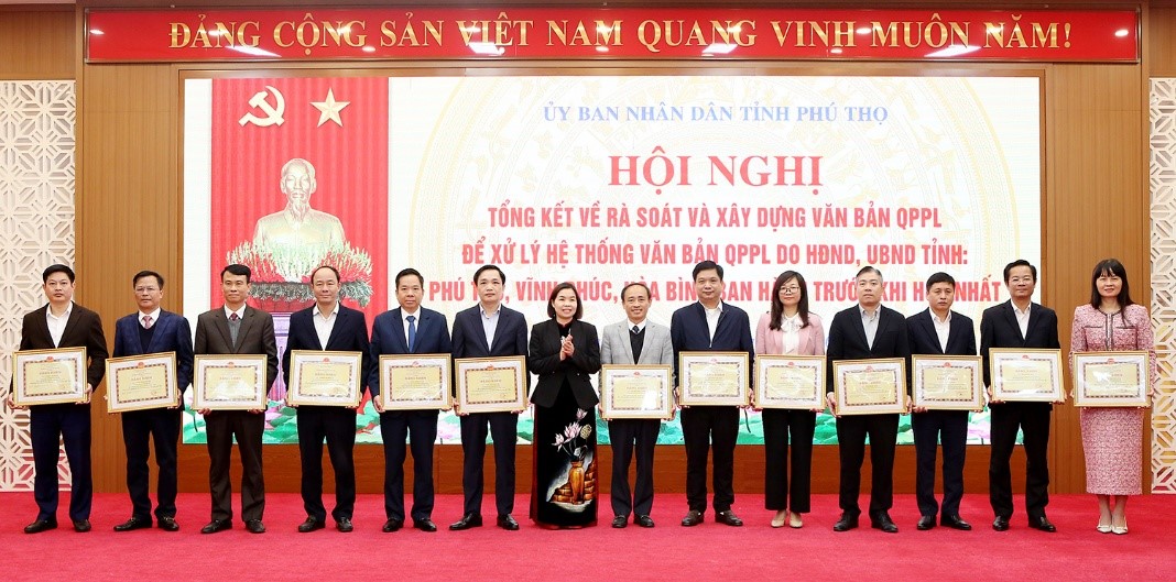 Nhân dịp này, nhiều tập thể và cá nhân vinh dự được nhận Bằng khen của Bộ trưởng Bộ Tư pháp và Bằng khen Chủ tịch UBND tỉnh vì có thành tích xuất sắc trong công tác rà soát, xử lý và ban hành văn bản quy phạm pháp luật tỉnh Phú Thọ.