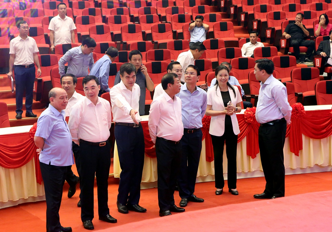 Các đồng chí lãnh đạo tỉnh kiểm tra công tác chuẩn bị trong hội trường